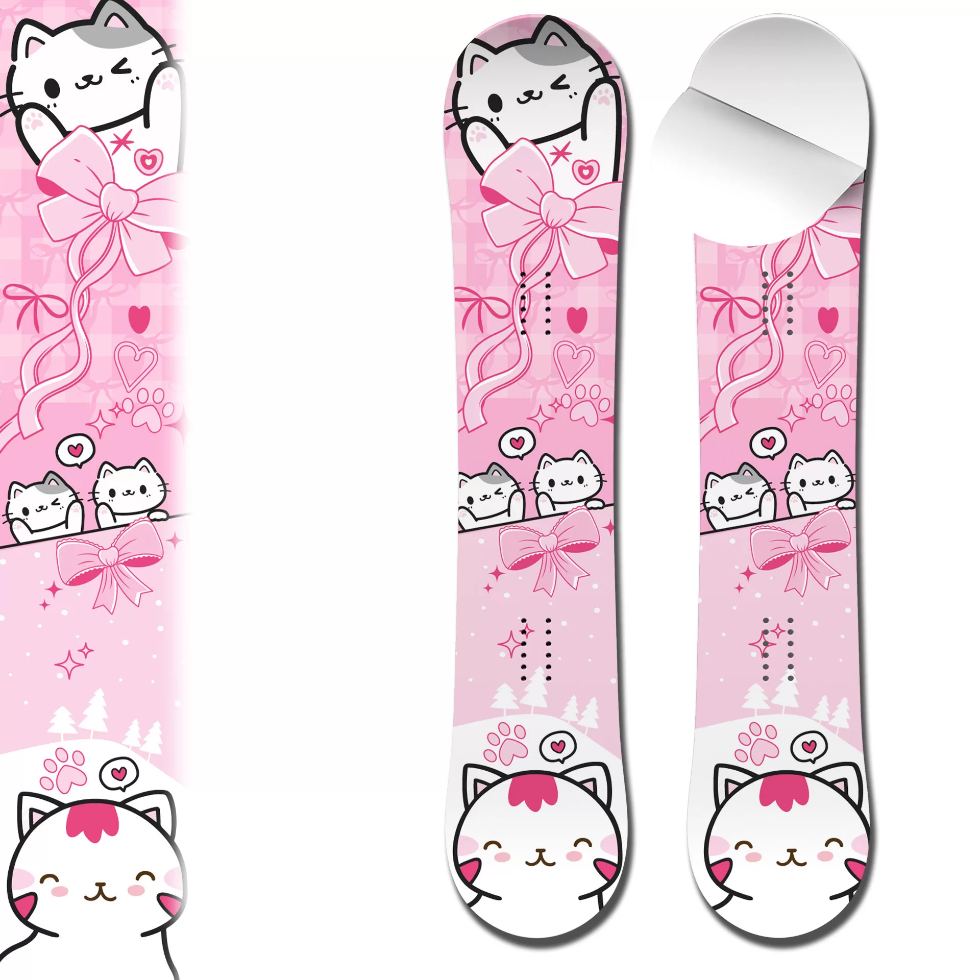 Custom wraps are the perfect way to protect your snowboard while adding original and eye-catching kawaii kitty graphic filled with pink ribbons and bows with cats and kitty waving hello.